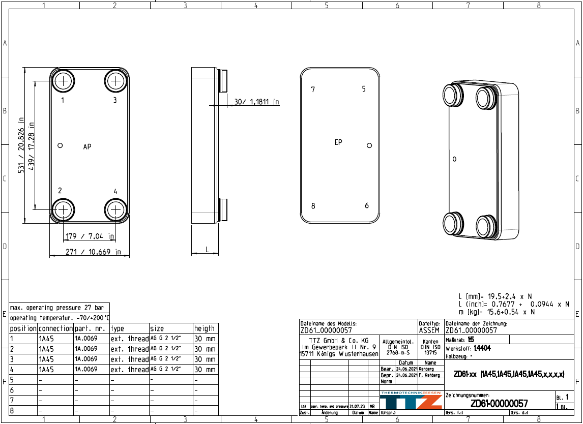 Außenmaß: 271 mm x 532 mm L-Maß: L[mm]=19,5+2,4 x N … Plattenanzahl abhängige Höhe „L“ des Apparates