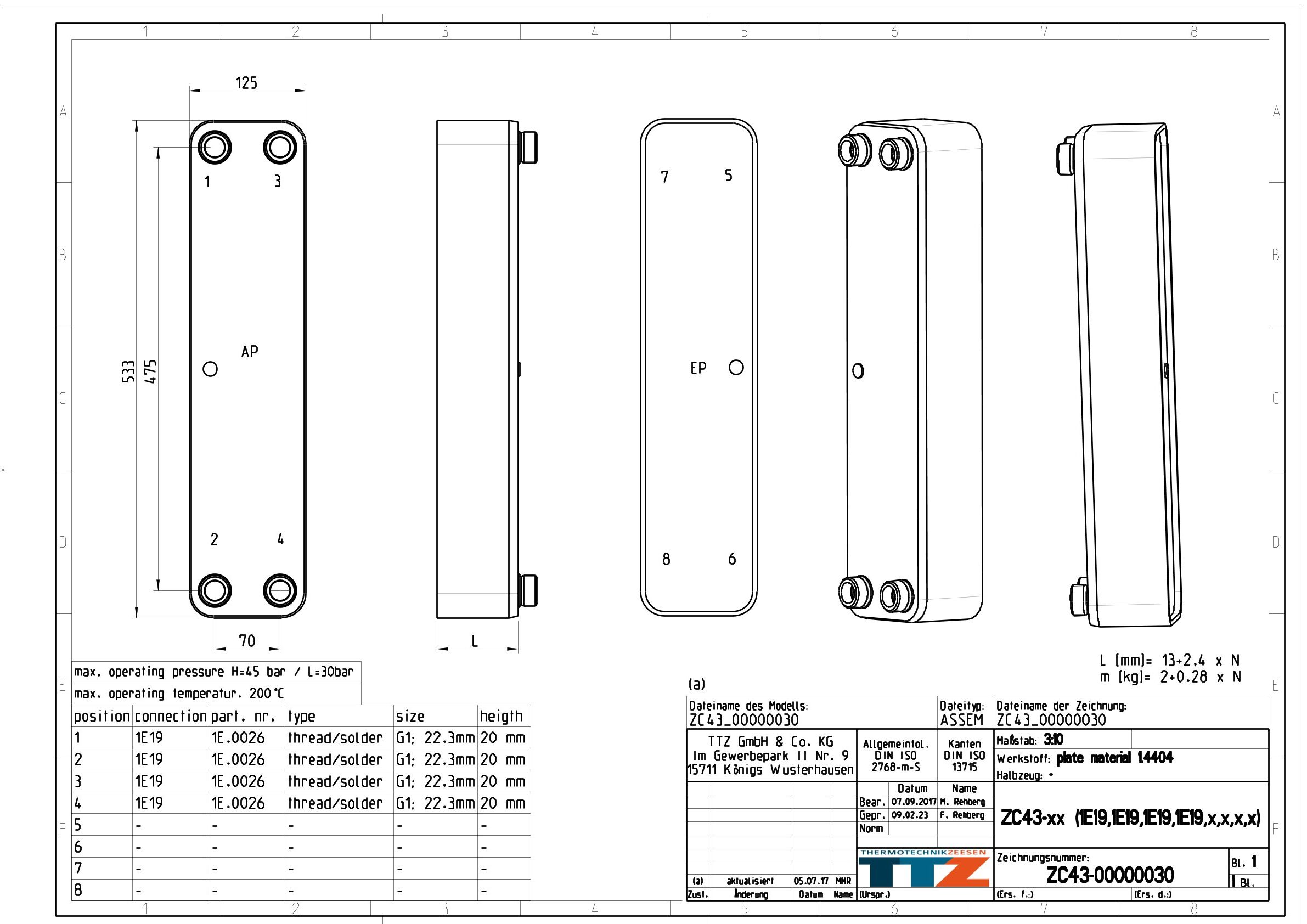 Unsere kupferverlöteten Edelstahl Wärmeübertrager (ZC-Serie) haben sich bereits viele Jahre erfolgreich auf dem Markt etabliert. Die TTZ-Plattenwärmeübertrager (bzw. Plattenwärmetauscher) sind dichtungslos, somit zeichnen sie sich durch einen geringen Bauraum aus. Durch ein innovatives Plattendesign führen hochturbulente Strömungen zu einem hohen Wärmedurchgangskoeffizient und somit zu einer hocheffizienten Wärmeübertragung. TTZ verwendet nur qualitativ hochwertige Materialien, welche im Zusammenspiel mit Erfahrung, Engineering und sorgfältiger Fertigung zu einem langlebigen und soliden Wärmeübertrager verarbeitet werden.