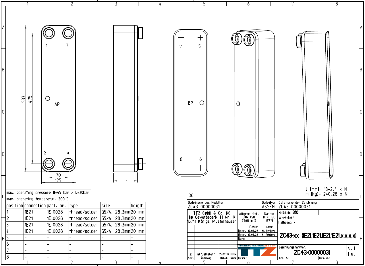 Außenmaß: 125 mm x 532 mm L-Maß: L[mm]=13,0+2,4 x N … Plattenanzahl abhängige Höhe „L“ des Apparates